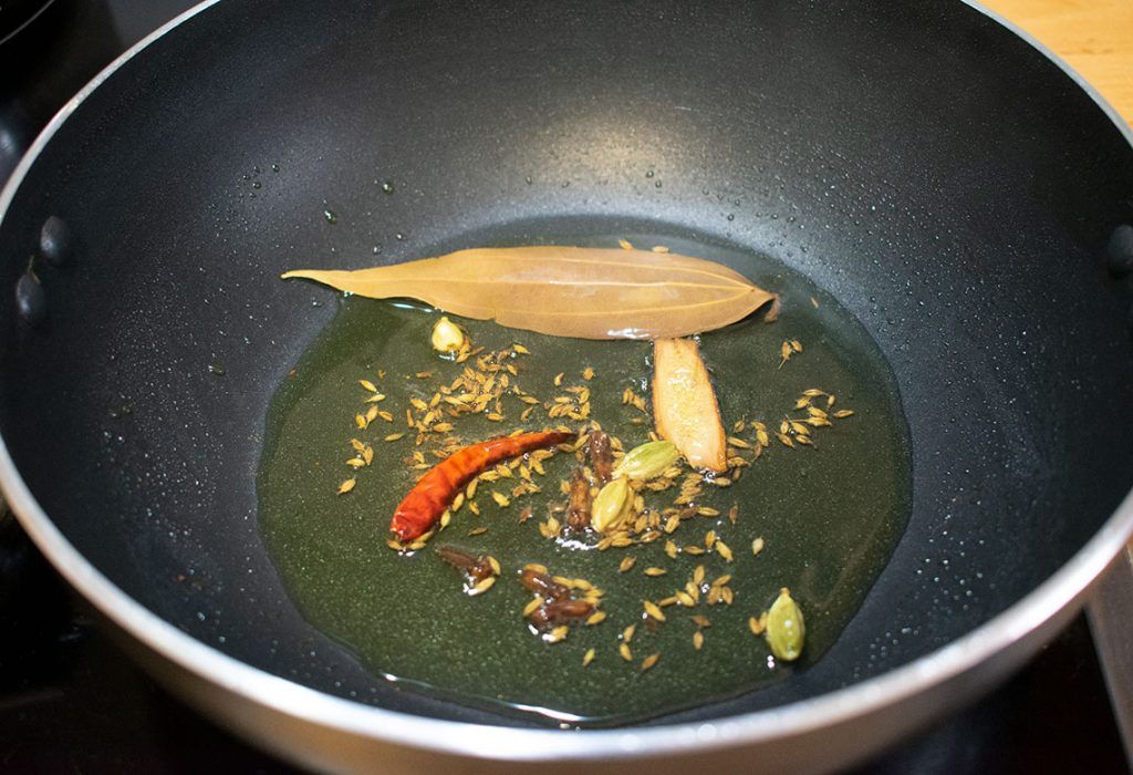 -Cuando el aceite esté caliente agregamos primero las cayenas y las semillas de comino. Cuando empiecen a crepitar añadimos las hojas de laurel, canela en rama, y los cardamomos.