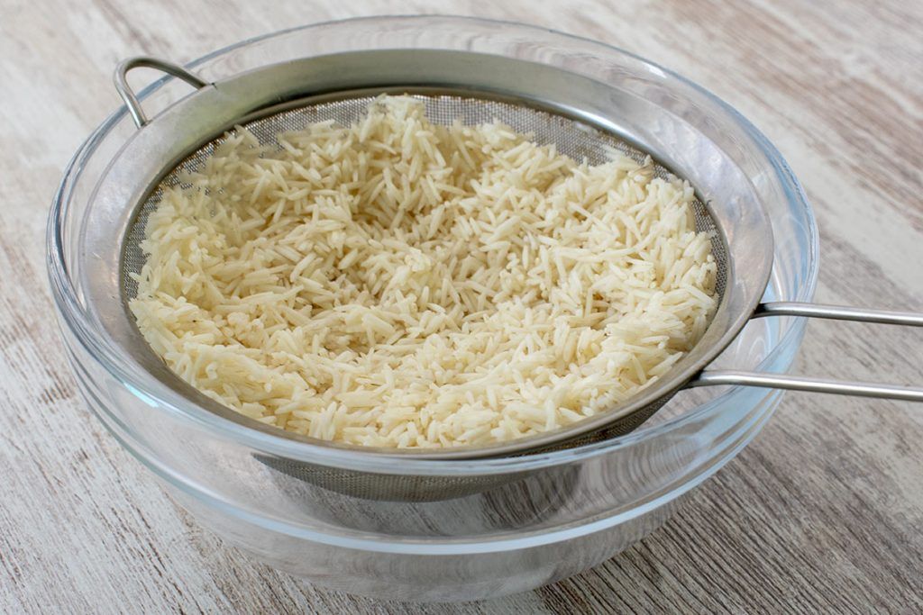 - Ponemos en un colador el arroz y lo lavamos abundantemente bajo el grifo. Dejamos el arroz en el colador durante media hora para que se vaya escurriendo todo el agua.