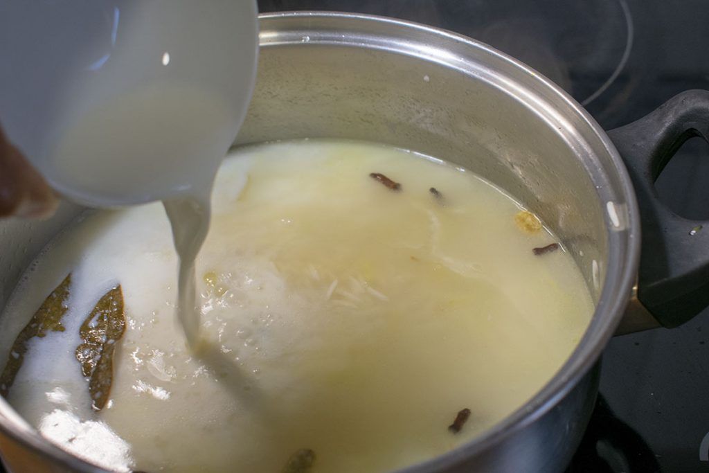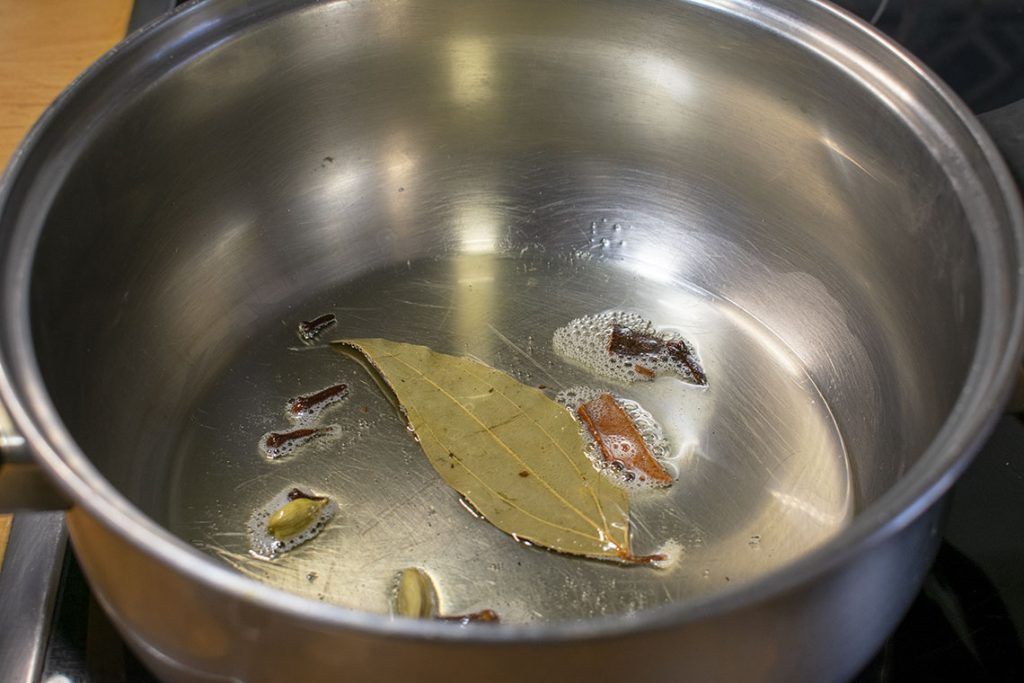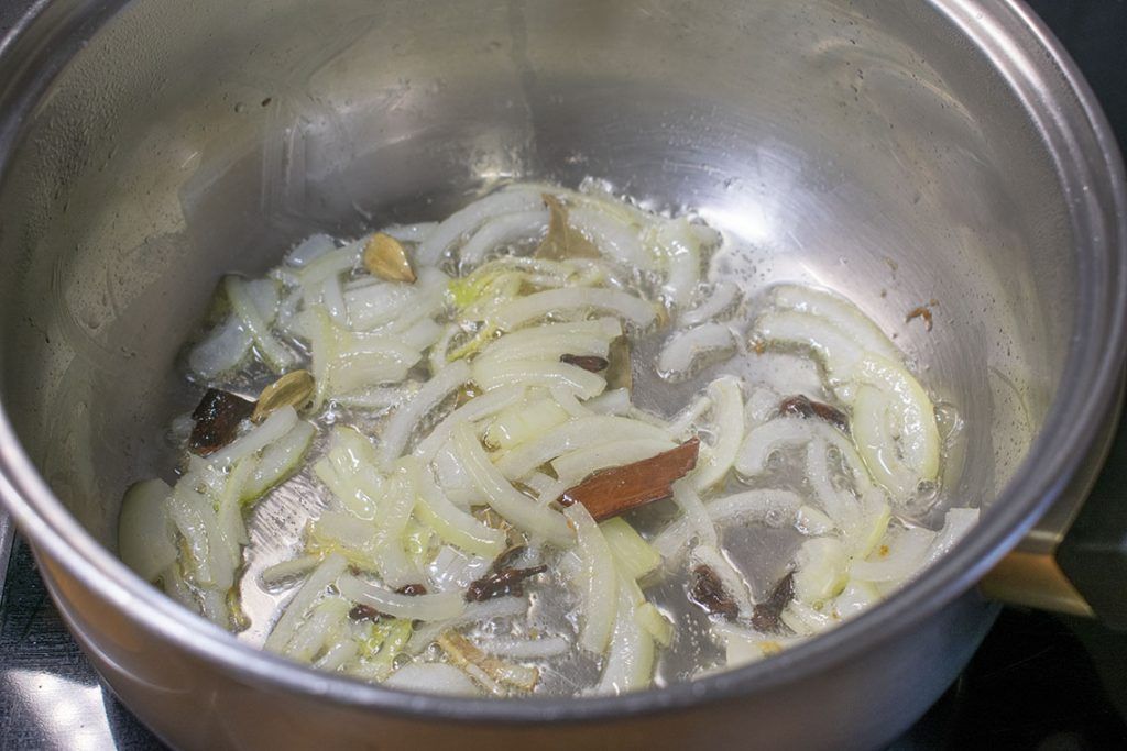 -En una olla ponemos el aceite o el Ghee y esperamos hasta que se caliente. Agregamos la hoja de laurel, el cardamomo, los clavos y la canela. Añadimos la cebolla y freímos hasta que se quede transparente.