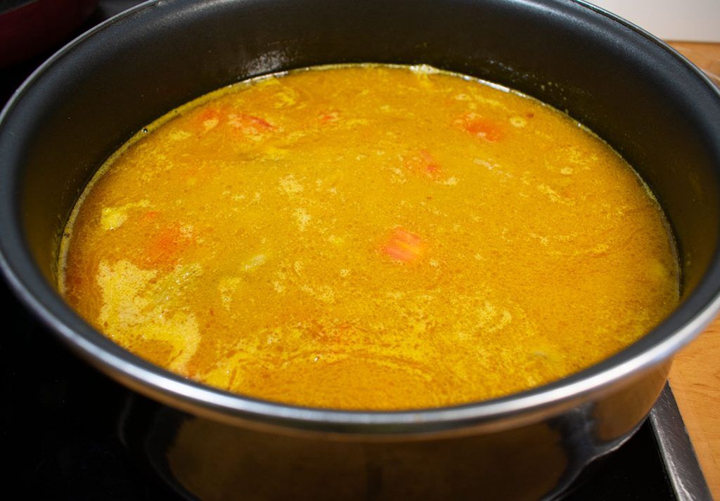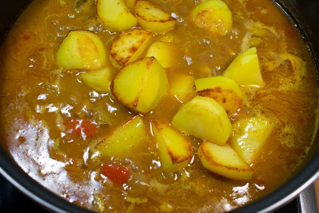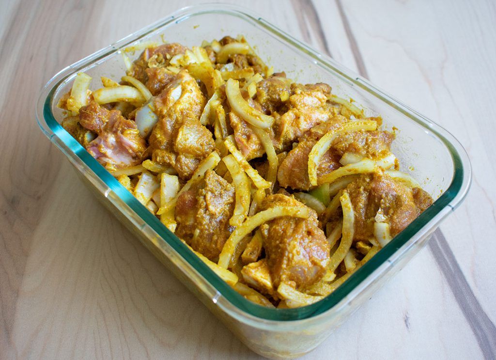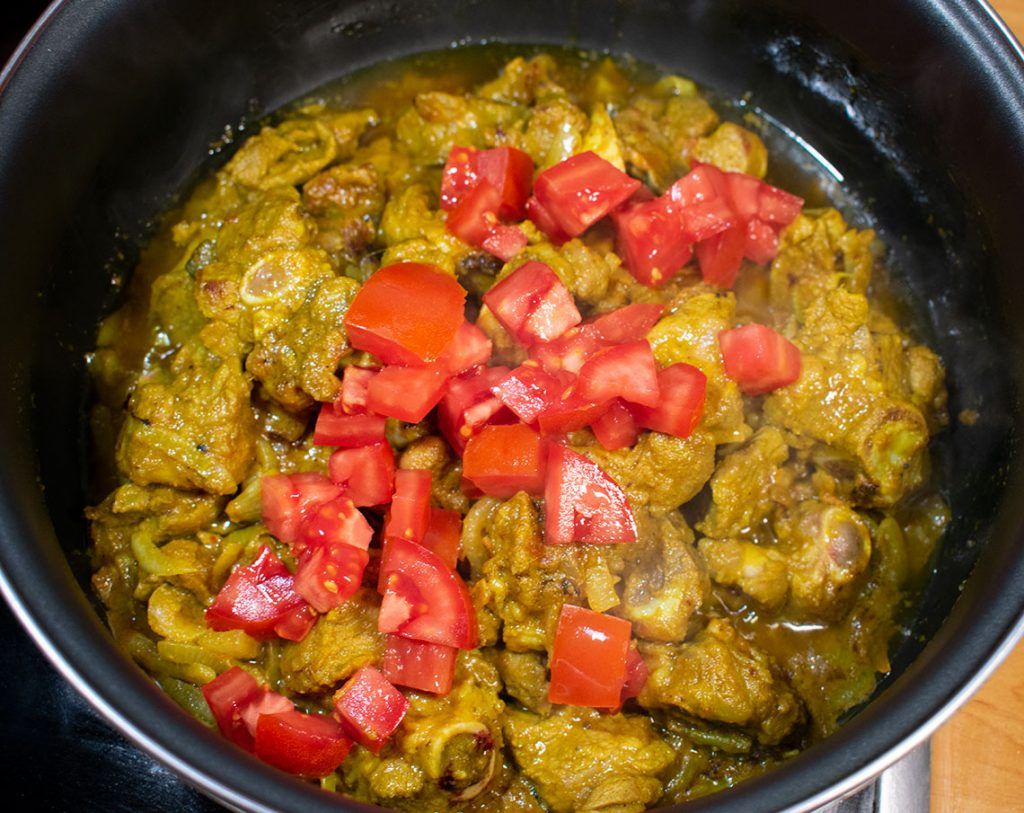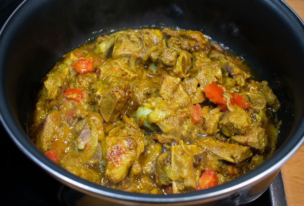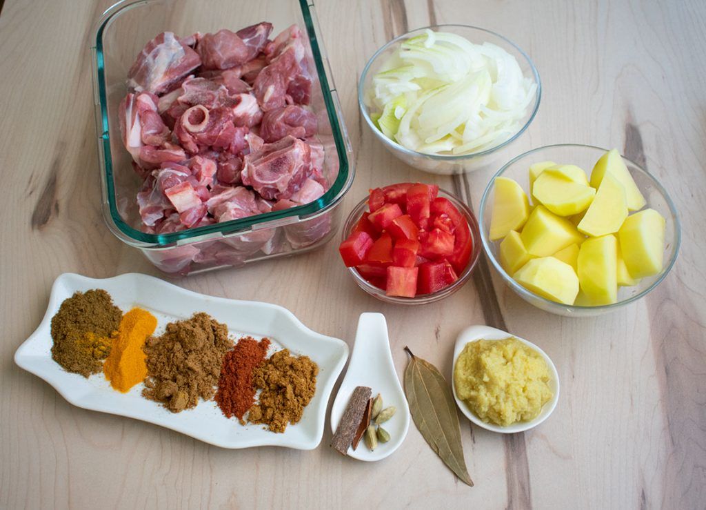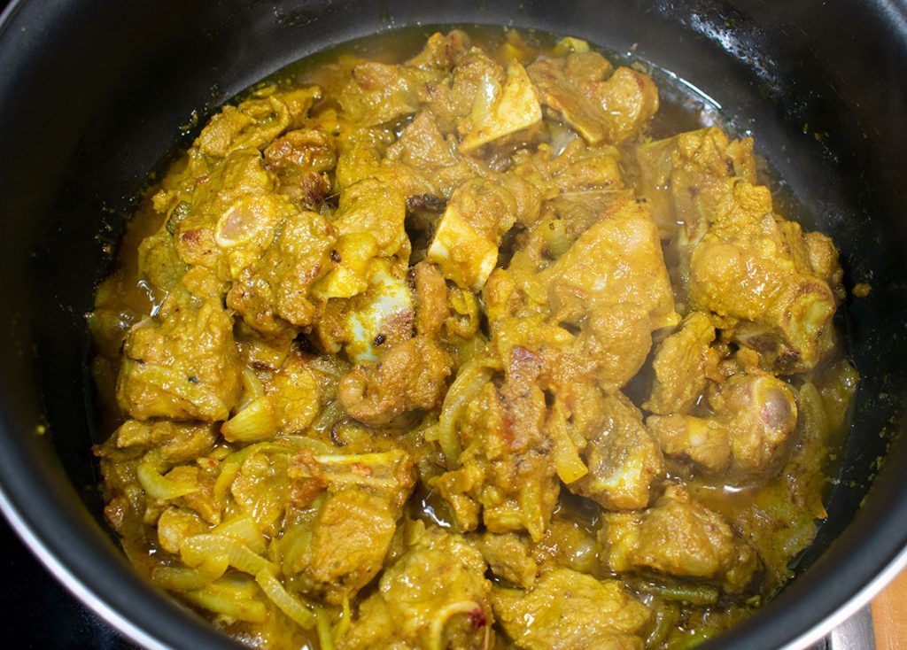Las especias que se utilizan para este guiso son muy similares a las del pollo al curry; la principal diferencia es que en este caso se macera la carne con todas las especias. Tradicionalmente se cocina con aceite de mostaza para potenciar el sabor de este guiso.