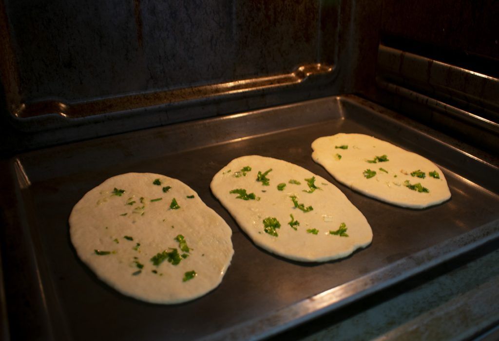 -Cuando vemos la parte inferior del Naan se ha dorado y se ha levantado ligeramente colocamos la bandeja en la parte media del horno.
