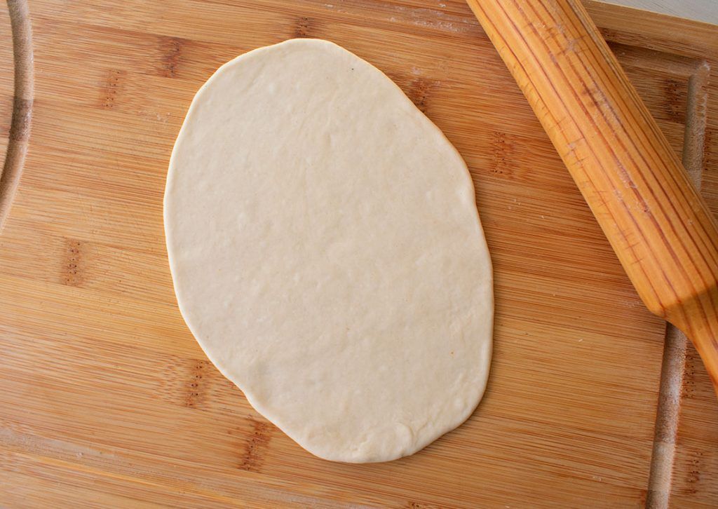 7. Cogemos una bolita y la estiramos dándole forma ovalada de 2 mm de grosor aproximadamente. Podemos espolvorear con poquito de harina si se nos pega abajo.