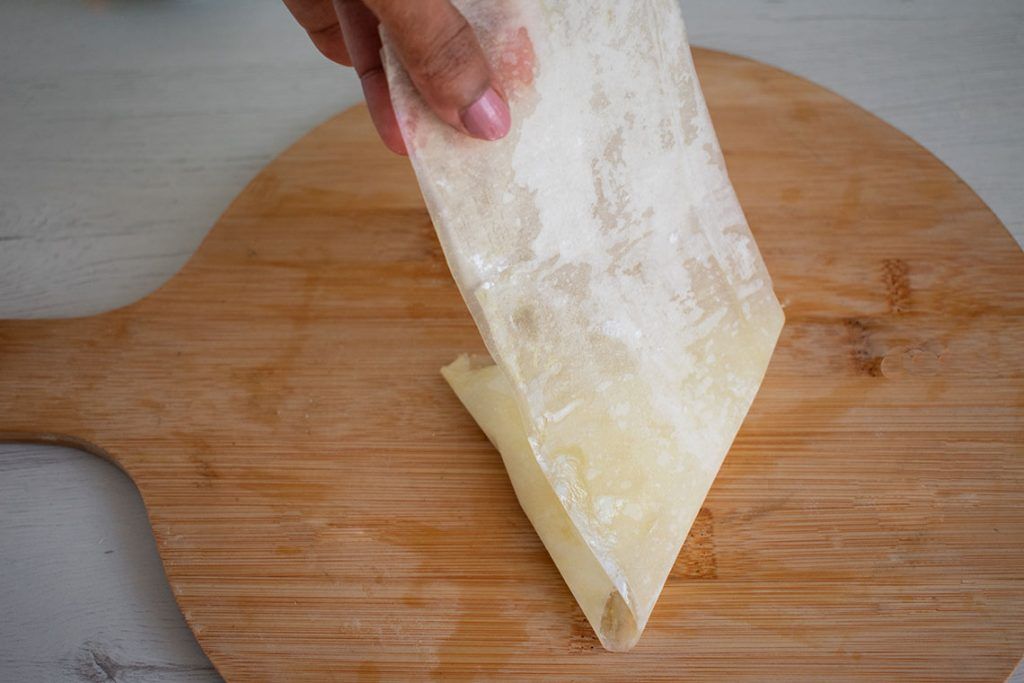 - Estiramos las láminas de pasta filo. Con una tijera cortamos las láminas de unos 8cm de ancho aprox.