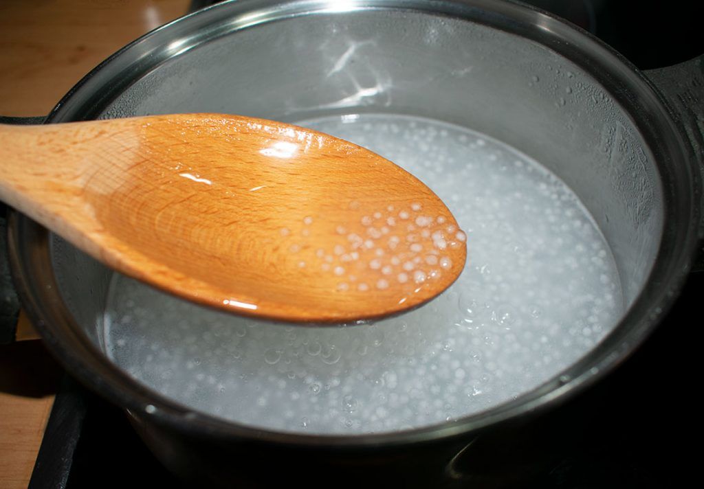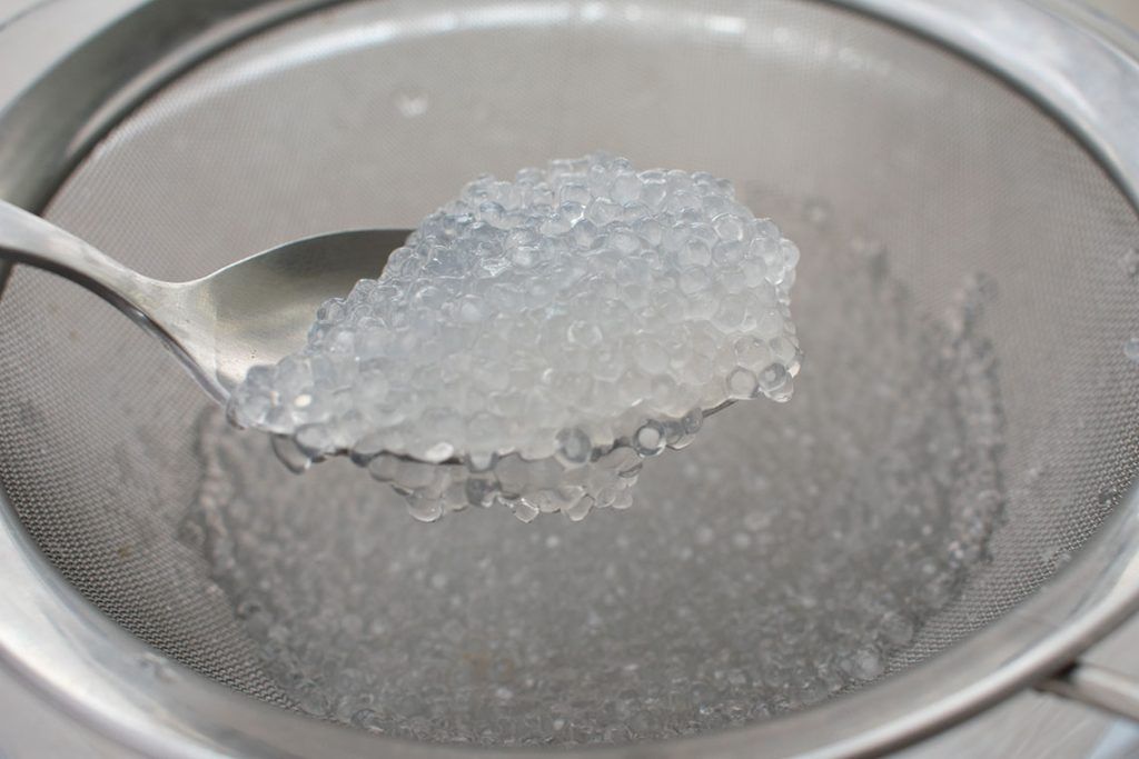 - Ponemos otra olla con 500ml de agua al fuego. Cuando empiecen a hervir añadimos las perlas de tapioca. Removemos muy a menudo y las cocinamos hasta que queden transparente.