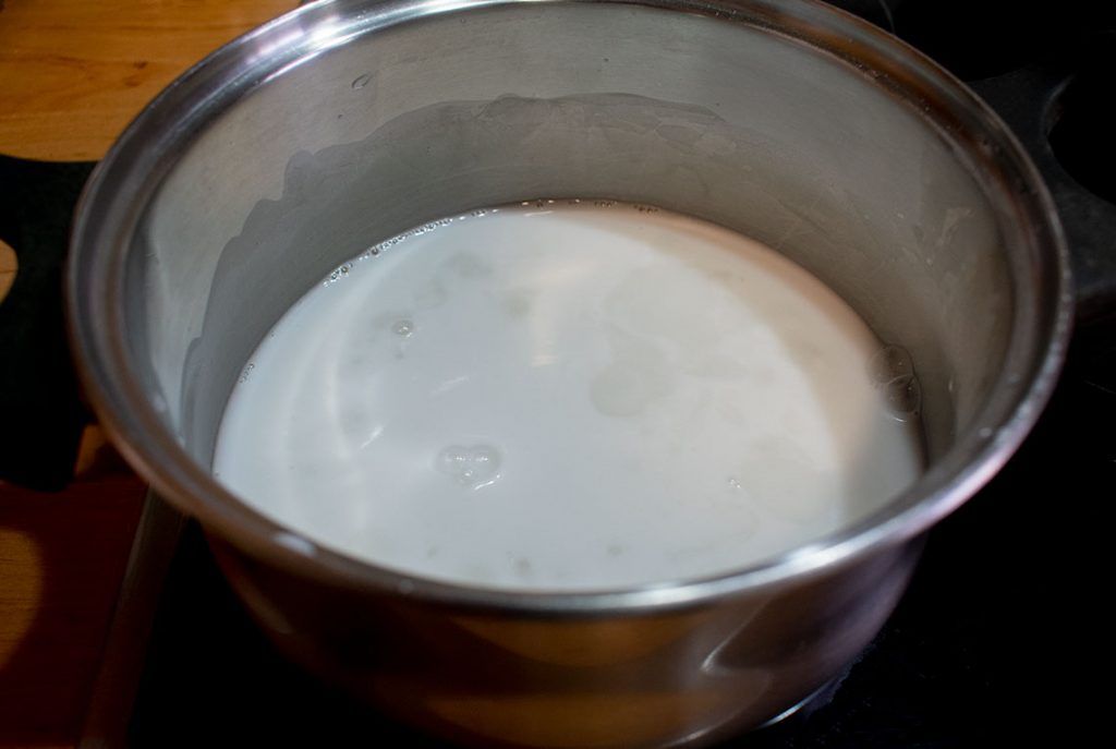 -Ponemos una olla al fuego y añadimos la leche de coco y el azúcar. Cuando disuelva el azúcar y se rompa a hervir la leche apagamos el fuego y la dejamos encima del fuego.