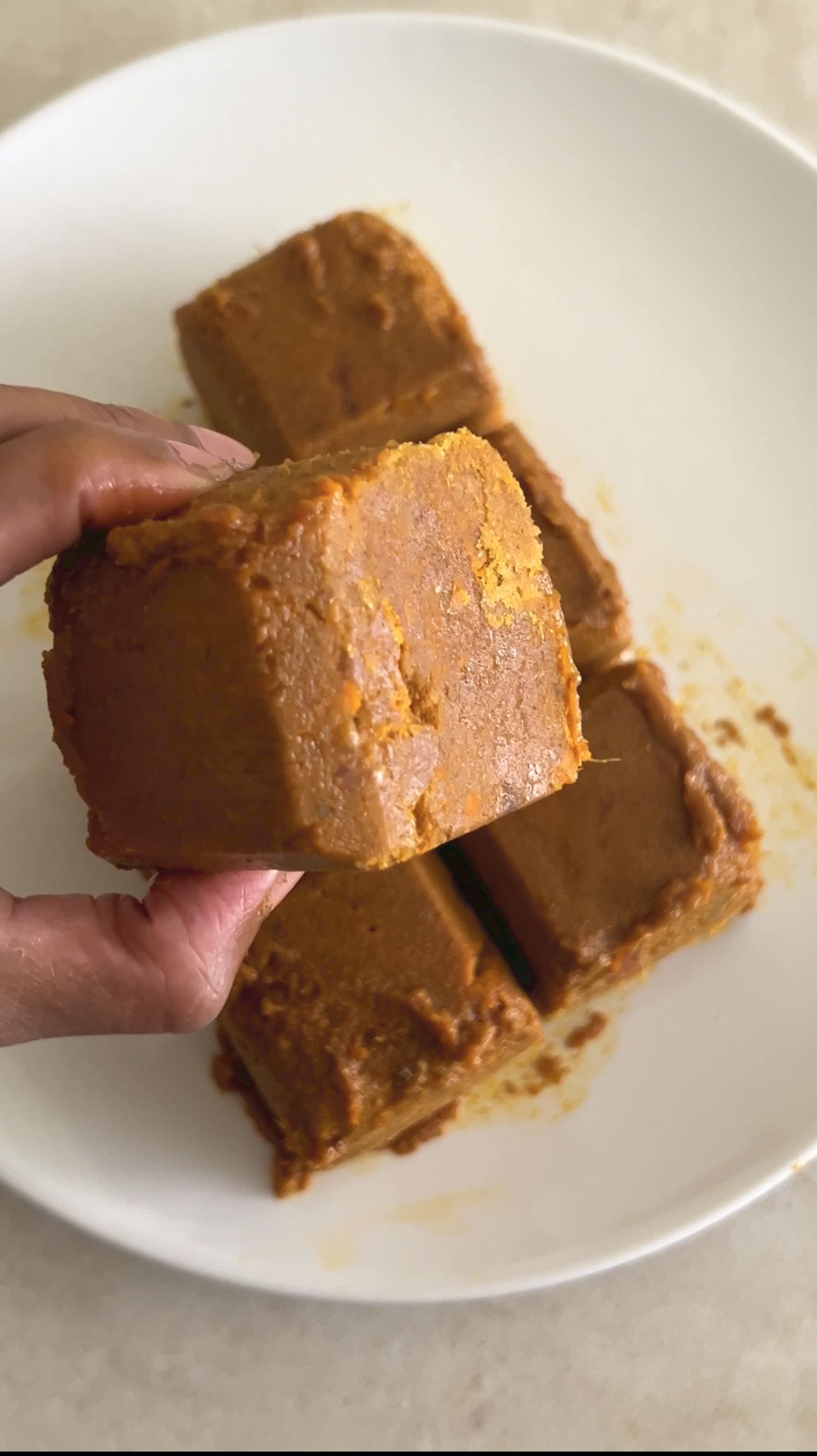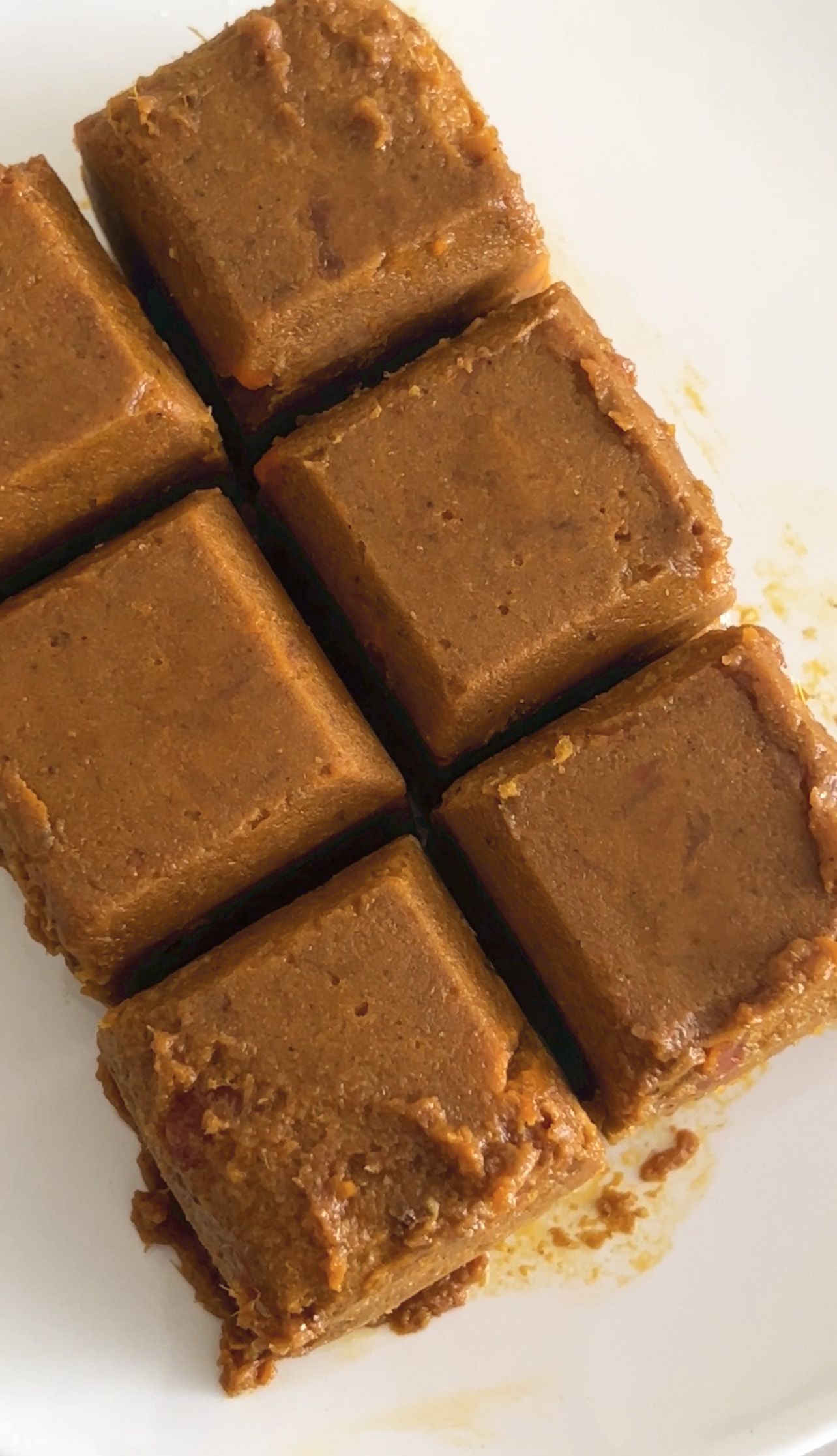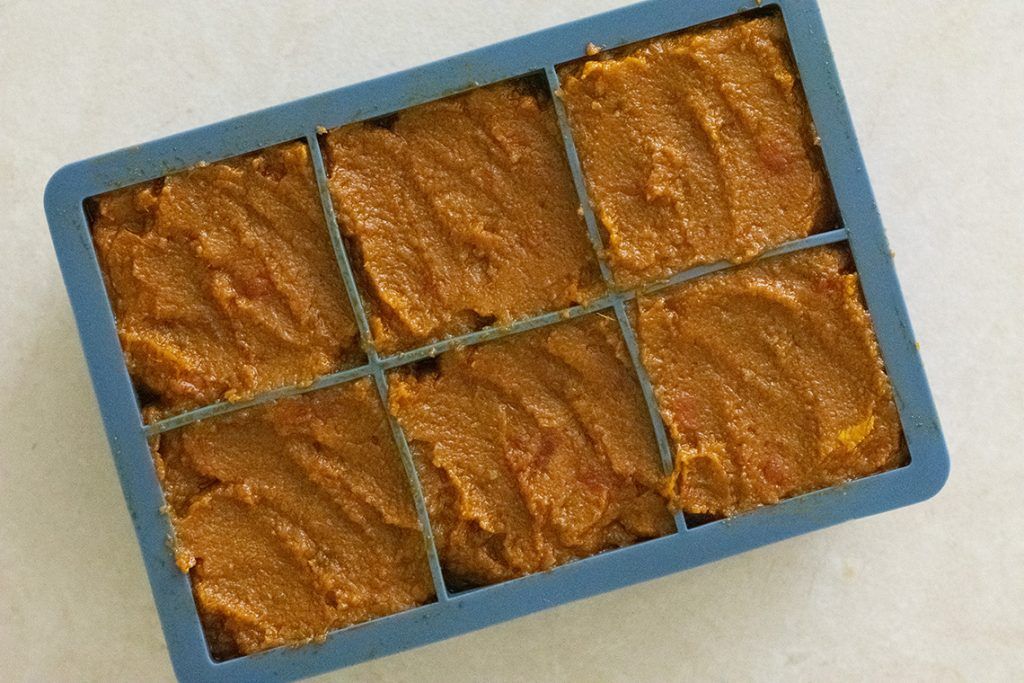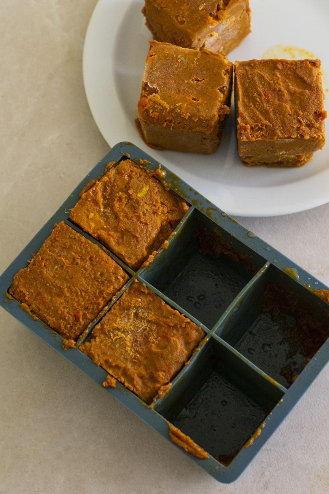 Cubitera de hielo: Para congelar en porciones he usado cubitera de hielo. Las cubiteras de tamaño grande funcionan mejor para congelar esta pasta. Yo he usado este.