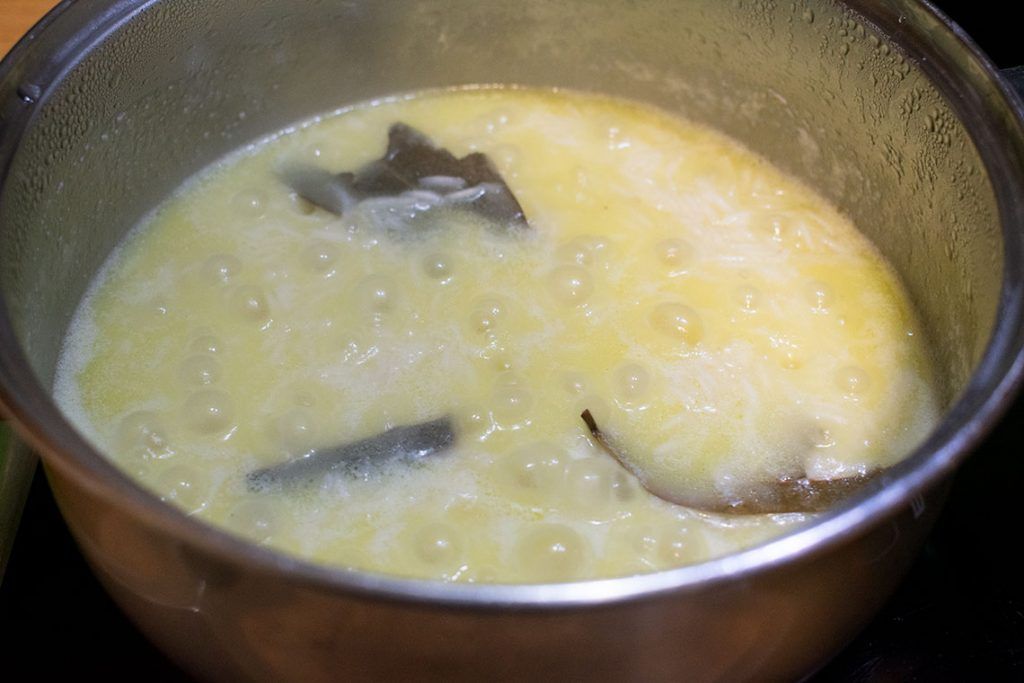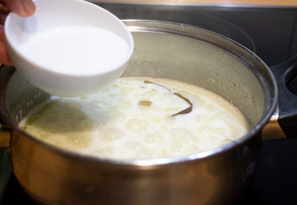 -Pour hot water and coconut milk. Then add salt and sugar. Stir everything together and bring it to a boil.