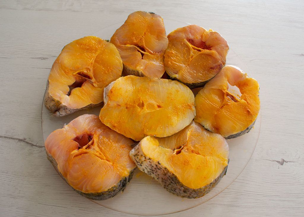 -Mix the hake steaks with salt and a little bit of turmeric powder and set aside.
