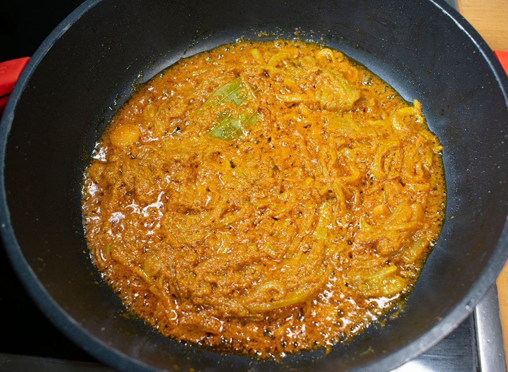 - Put a large pan with oil on medium-high heat. When the oil is hot, add the bay leaf and cumin seeds. Add onions and fry them until golden brown.