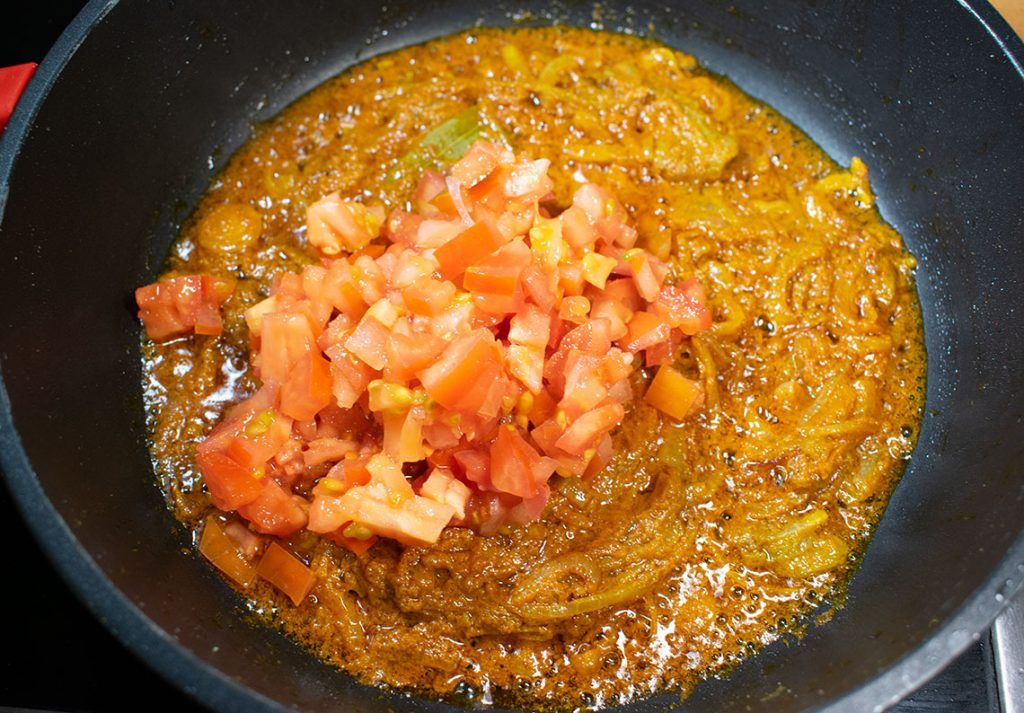 - Add ginger paste and sauté for few seconds. Then add the spice mixture and tomatoes. Fry everything together until the oil separates.