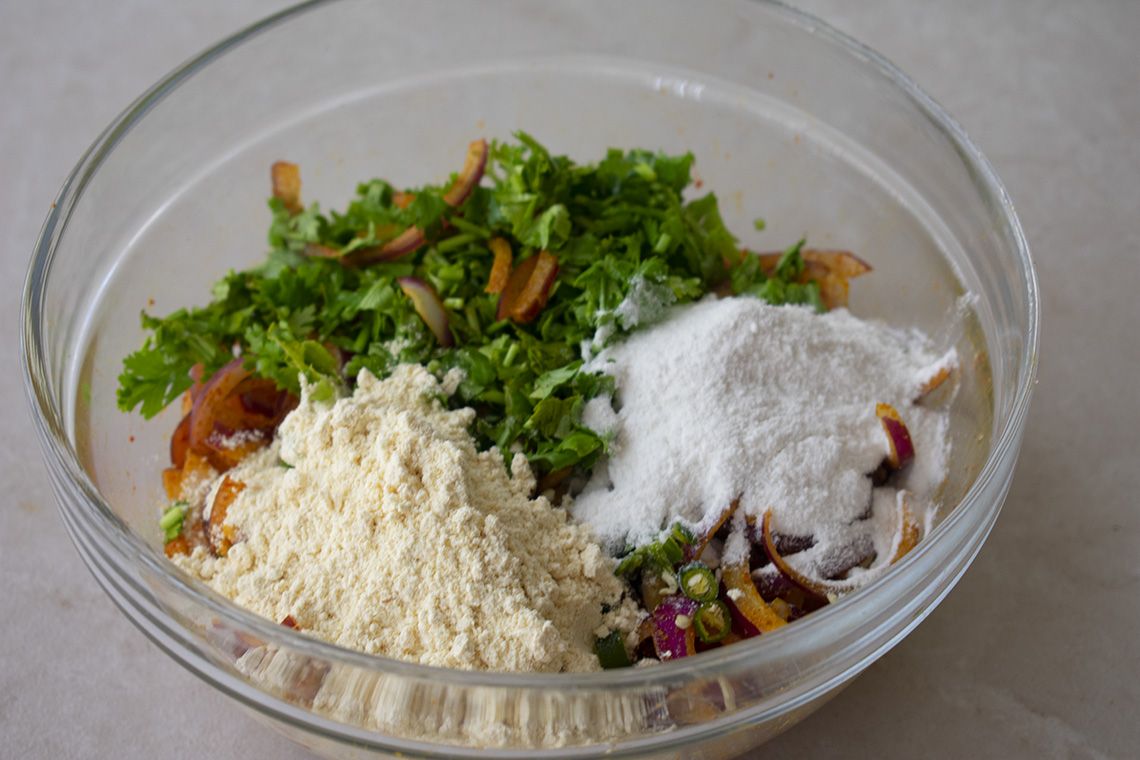 Cebolla, especias, harina de garbanzo, harina de arroz para preparar Bhajis de cebolla