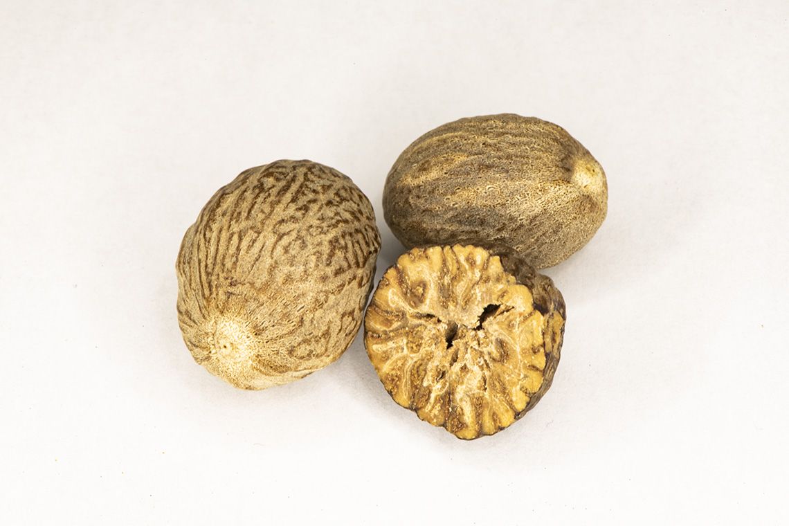 La nuez moscada es el fruto del árbol Mirística de origen Indonesia. La macis y nuez moscada vienen del mismo árbol, la cáscara que rodea la semilla (nuez moscada) se llama macis. En la india se conoce como Jaiphol. Tiene forma ovalada y arrugada. Es marrón oscuro por fuera y marrón claro por dentro.